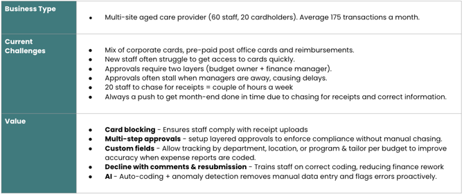Weel Premium is designed to eliminate repetitive finance admin and enforce good financial habits automatically. These examples show how Premium features remove common pain points for larger or more complex teams.